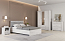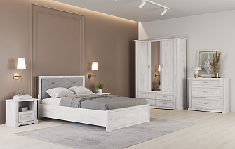 Стандартный гарнитур для спальни включает в себя кровать, шкаф и две тумбочки.